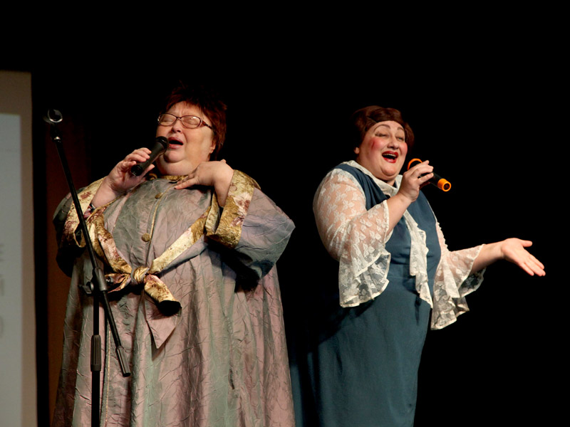 Коллеги вспоминали, какие были тяжелые времена раньше, как союз вставал на крыло, как искали новые формы объединения, деятельности, привлечения новых сил. Лучше всех выступил народный артист РФ, старейший актер театра музкомедии Иван Ромашко: «В этом доме было пусто, В нем хранилася капуста, а теперь взамен капусты Здесь работники искусства». Какой-то капусты всегда мало, а какой-то капусты всегда много, ведь капустник - традиционная форма поздравлений в театре. Так, от кукольного театра юбиляра поздравляли Чебурашка, Гена и Шапокляк, от музкомедии – народный трагик в маске, а от ГДТ – опытные оперные матроны (на фото).