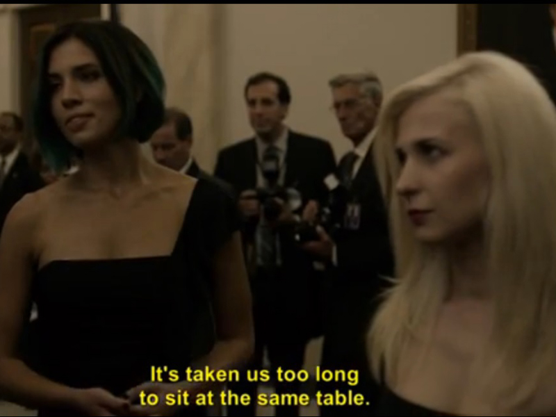 Надежда Толоконникова и Мария Алехина из сканадльной группы Pussy Riot выложили в сеть ролик с эпизодом из третьего сезона сериала «Карточный домик» с Кевином Спейси в главной роли, где они дебютировали как актрисы. Девушки появляются в образе светских дам – блондинка и брюнетка, декольте, платье в пол – и обращаются к официальному представителю: «Виктор Иванович, вы обсудили в закрытой части переговоров те вопросы, которые обещали поднять?». Кого именно играют дебютантки, из ролика протяженностью полминуты догадаться трудно.