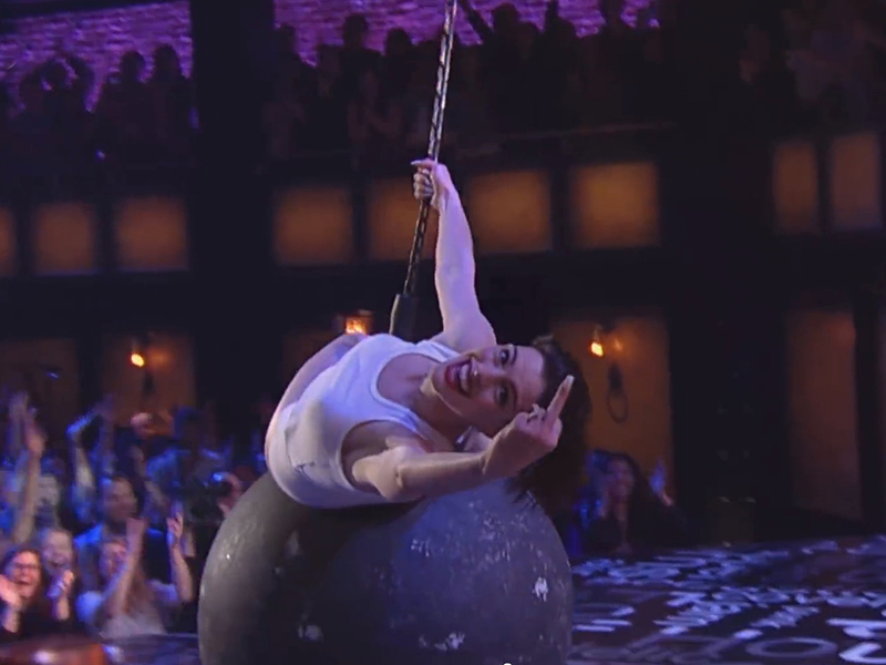 32-летняя участница получила задание сделать пародию на скандальную исполнительницу Майли Сайрус и воспроизвести фрагмент из ее клипа Wrecking Ball. Энн Хэтэуэй появилась в майке и трико, затем оказалась в более открытом одеянии. Кульминацией выхода стал акробатический прыжок на огромный шар, подобный тому, на котором восседала в своем видео Майли Сайрус. Видео с пародией Энн Хэтэуэй моментально стало набирать популярность в Сети и почти за сутки собрало больше 3 миллионов просмотров.