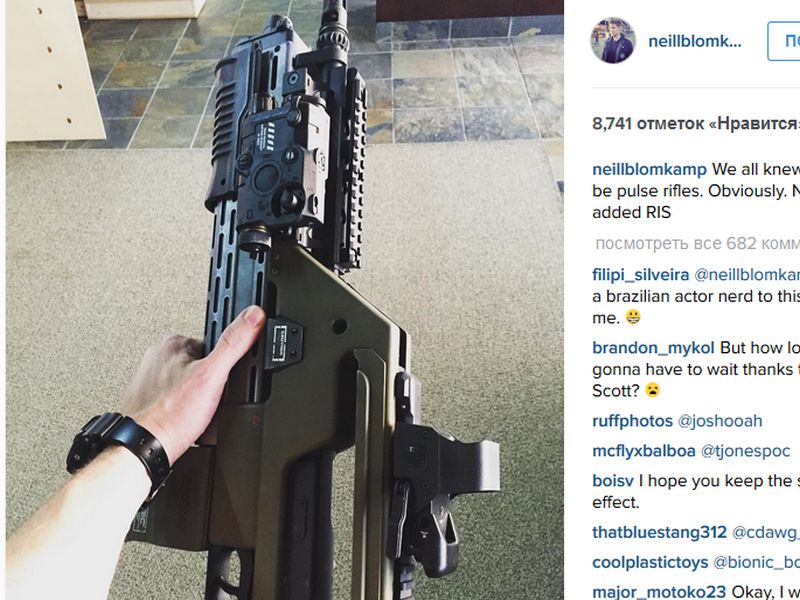 На своей официальной странице в Instagram режиссер продемонстрировал импульсную винтовку M41A, которой были вооружены десантники из кинофильма «Чужие». «Мы все знали, что будет импульсная винтовка. Это очевидно», - написал Бломкэмп в комментариях к снимку.