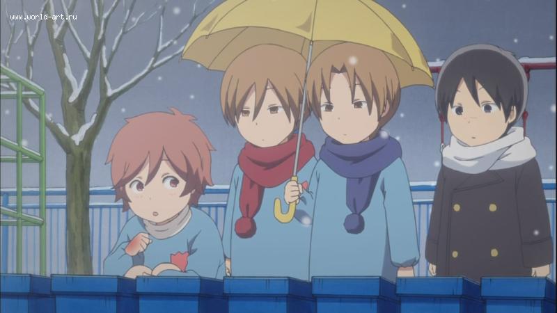Из новых вещей я решила посмотреть онгоинг, стартовавший в осеннем сезоне этого года - "Ты и я". Я пыталась начать смотреть его еще в октябре, но сломалась на первой же серии. Тогда он мне показался очень нудным, медленным и ни о чем. А в моем нынешнем состоянии все вышеописанные пункты внезапно стали преимуществом, я и решила попробовать еще раз. И угадала. Там про быт и учебу нескольких парней, как водится, обыкновенных японских школьниках. Только они не становятся супергероями и к ним не являются ангелы/демоны/ пришельцы, нужное подчеркнуть. Они просто ходят в школу и трут там свои очень медленные терки. И все. Очень медленно и спокойно, не динамично, и ни на что не влияюще трут. Самое то, что нужно при высоченной температуре. Там даже графика какая-то медленная и размеренная, не резкая и в чем-то сглаженная. Или мне так от температуры показалось? Но нарисовано довольно мило и меня ничего не раздражало.