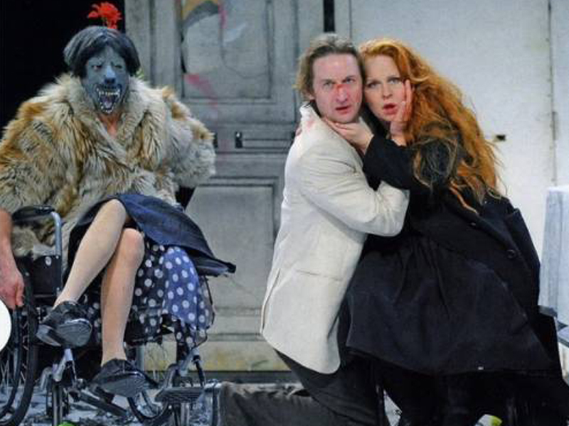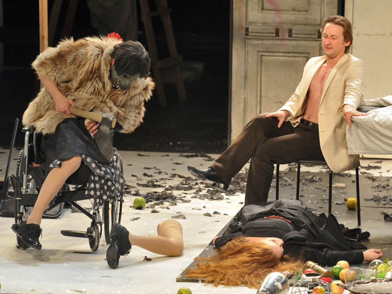 Взрыв хохота раздается в зале после слов доктора Дорна "не знаю, может, я чего-то не понимаю или сошел с ума…". Это что-то декадентское! Оно полезно тому, кто еще не излечился от любви к театру. Никаких иллюзий на сей счет пятидесятилетний режиссер не оставляет. Театр у него – это пожирающее талант чудовище, которому служат изгои с извращенной психикой, утратившие остатки человеческого. Постулат доказывается с бешено колотящимся сердцем, при сбившемся дыхании, на срыве голоса, в конвульсиях и корчах, как и полагается в сумасшедшем доме. В финале каждого акта на сцену врывается бешеный Бутусов, чтобы вмешаться в процесс – крушит декорацию, дергается в пляске смерти, выкрикивает в микрофон нечленораздельные выкрики. Иногда это происходит на фоне двух Маш, синхронно катающихся по ковру. "Как все нервны" – констатирует доктор Дорн, применяя щадящий эвфемизм для обозначения порока, а потом увозит на тележке всю эту братию – сваленных в груду кукол с торчащими конечностями.
