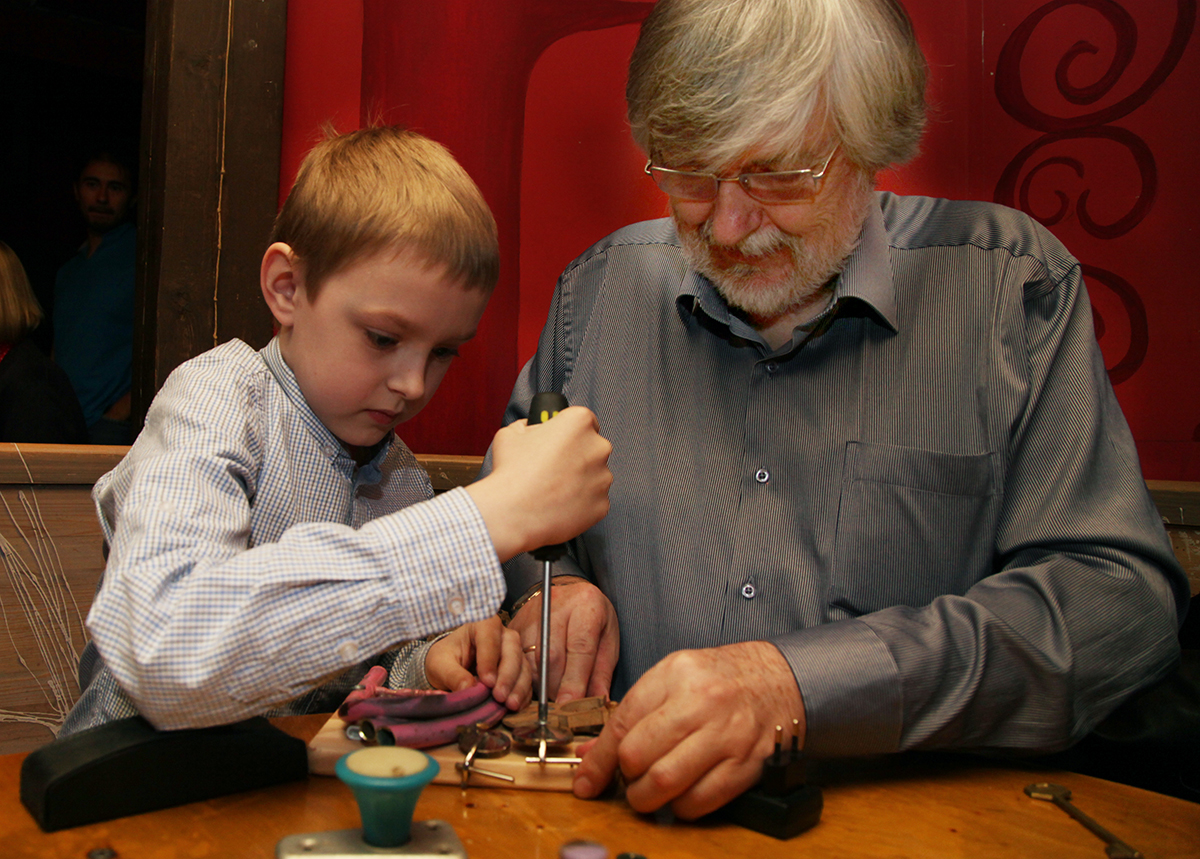 Казалось бы, ерунда какая - собирай всякий хлам да пихай в гитары. А вот и нет. Владимир Авдеев предложил гостям на своем опыте убедиться, каково это – оживлять инструмент в технике «ассамбляж». Дабы упростить задачу, выдал обычную разделочную доску, напоминающую деку гитары, отвертки, шурупы, ну и аксессуары в виде зажигалки, дверного ключа, ручки от шкафа, штепсельной вилки. В творческом процессе участвовали и дети, и взрослые.