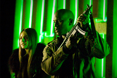 В принципе, аналогии с "Терминатором" начинаешь проводить с самого первого кадра. Вот архангел Михаил картинно падает с небес и не менее картинно поднимается с земли. Вот он картинно прижигает следы от крыльев на спине. А вот он совершенно по-шварцнеггеровски выбирает себе "пушку". Конечно же, будет знаменитая сцена с проламыванием крыши автомобиля, чтобы добраться до новоявленной Девы Марии (которую в этом фильме зовут как Чаплина – Чарли). И много чего еще. Одного только этому фильму явно не хватает Кэмерона.