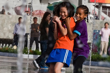 А история вот о чем: Дре Паркер (Джейден Смит) – двенадцатилетний чернокожий пацан, вместе со своей мамой едет на ПМЖ в Китай. Мама стремится слинять из Америки по одной простой причине – муж погиб, оставаться в опустевшем доме нет сил. Правда, не совсем понятно, почему для проживания выбран именно Китай. В Китае мальчик, разумеется, учится говорить по-китайски, ходить в китайскую школу, носить красный китайский галстук, кушать палочками и общаться с китайскими сверстниками. Получается это у него не то чтобы очень хорошо.